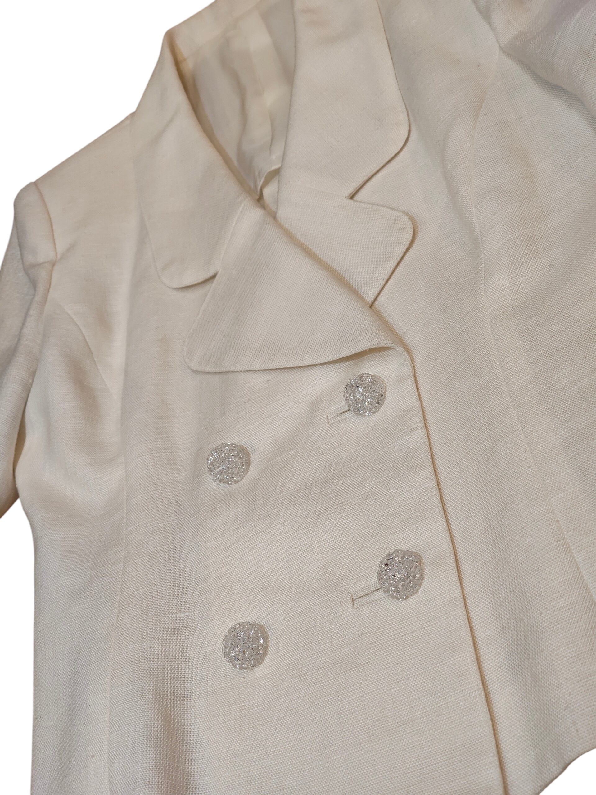 裏地の背抜き仕立てや、縫い代が美しいパイピングで伏せられ、見えない細部まで仕立て良く作られています。また、ボタン一つとっても、アンティークのような繊細な装飾が施されており、この一着に対しての熱量が感じられます。