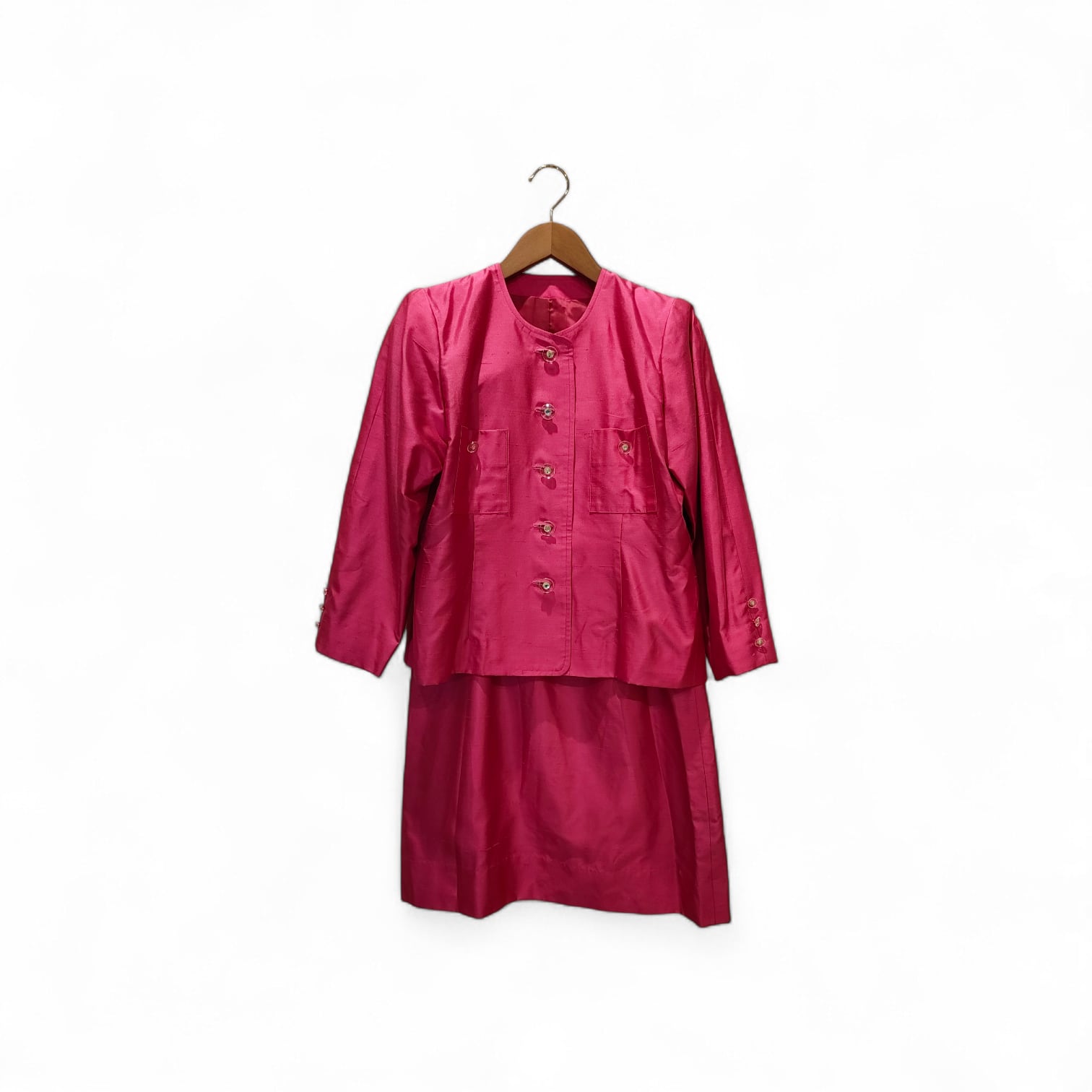 ジャケットには透明感のある多面カットの装飾ボタンが贅沢にあしらわれ、ノーカラーのミニマルな首元が洗練された印象を与えます。スカートは、腰回りのタックから生まれるドレープが美しく、歩くたびにシルク特有の軽やかな擦れ音が響く、五感を刺激する一着です。